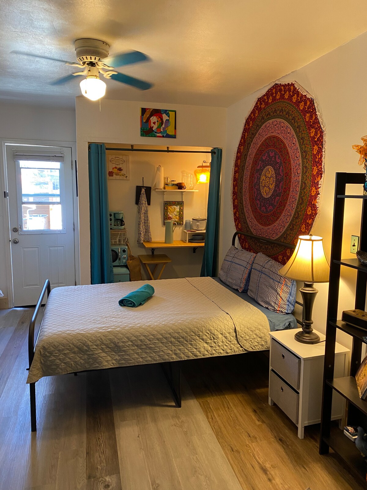Bienvenue à votre base d'accueil pour des aventures en montagne ! ~800 pieds carrés de chalet tipi coloré du milieu des années 60. Entrez dans un salon double hauteur avec plafond en bois apparent, mezzanine ouverte avec lit King Size au-dessus et kitchenette entièrement approvisionnée en dessous. Il y a une deuxième chambre et une salle de bain au rez-de-chaussée. Vos hôtes sont des fans et des artistes de science-fiction vintage, avec des influences et des œuvres dans tout le logement. Découvrez ce sur quoi nous travaillons actuellement et quelques points d'intérêt locaux sur notre compte IG @triangle.house !