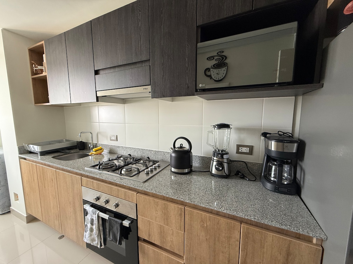 Situé dans le quartier touristique de Miraflores, à 5 min à pied des lieux touristiques tels que le parc Kennedy et Larco Mar, à 1 min de la gare routière, à proximité des supermarchés, des commerces de proximité et des restaurants. Super confortable, spacieux, lumineux et accueillant. Lit queen avec matelas de première ligne pour que votre repos soit agréable, canapé-lit 2 places, cuisine entièrement équipée, eau chaude, lave-linge séchant, TV 65 pouces. Bâtiment avec espace barbecue, feu de camp, coworking et gym. Zone sécurisée.