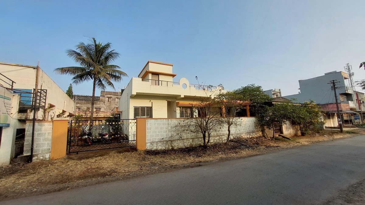 Shrishalya Bungalow est une villa indépendante de 2000 pieds carrés 2BHK dans le paisible Gadmudshingi, Kolhapur Accès routier de 40 pieds Stationnement sécurisé pour deux voitures, y compris un VUS à l'intérieur des locaux Chambre principale climatisée, deuxième chambre naturellement fraîche, matelas orthopédiques, 2 salles de bain attenantes cuisine, WiFi 40 Mbps et télévision OTT. Verger privé avec des arbres à chikoo et à noix de coco. À 9 km du temple Mahalaxmi, 1,5 km de la route nationale. À 100 m de l'autoroute. Sécurisé, fermé, animaux acceptés avec le soutien du gardien.