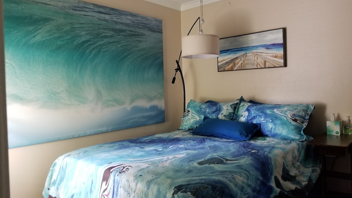 Chambre privée avec salle de bain privée séparée. Lit double. Pas d'enfants de moins de 12 ans. Maison non-fumeur et sans drogue. Nous avons deux caniches (chiens non allergènes). Invités uniquement autorisés à l'étage pour des raisons de confidentialité et de sécurité. Veuillez consommer de la nourriture en bas pour éviter les fourmis, les taches de graisse et les déversements. Utilisez la table à manger en bas ou mangez à l'extérieur sur l'un des patios, si vous apportez de la nourriture dans la maison. Ne placez pas de serviettes humides sur les meubles, dans les placards ou sur les draps de la chambre.
