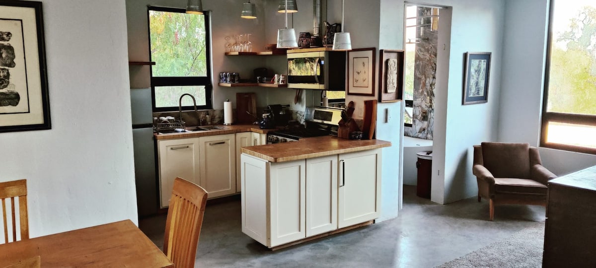 Maison en adobe d'une chambre avec cuisine, salle de bain, salon avec canapé, cheminée et terrasse privée. Nos voyageurs peuvent utiliser les espaces communs comme une palapa, une grande cuisine et une table à manger extérieure. Sur la même propriété se trouvent 2 autres bâtiments avec une chambre et une salle de bain privée. Il y a beaucoup d'espace pour marcher, lire ou faire du yoga.