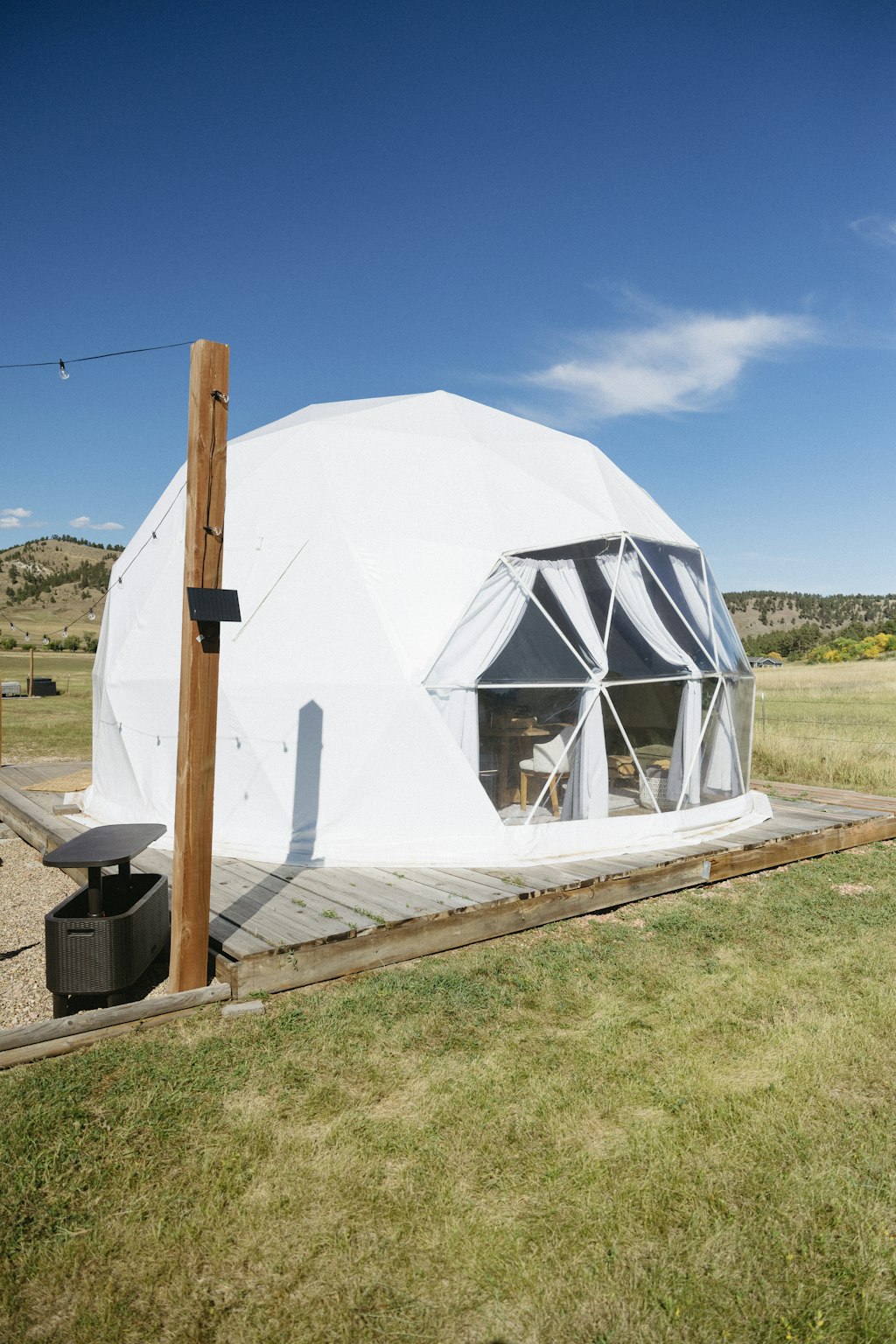 Profitez de la beauté de la nature dans un dôme géodésique surplombant le lac Red Rock. Parfait pour les amoureux de la nature, les escapades romantiques, les anniversaires, les anniversaires ou même une retraite d'affaires paisible alliant confort et vues à couper le souffle. Elle dispose d'une lumière solaire télécommandée au-dessus du lit qui s'allume au crépuscule et peut être éteinte sans quitter votre lit. Les panneaux solaires et un système de batterie fournissent une alimentation pratique pour recharger les petits appareils essentiels, afin que vous puissiez rester à l'aise tout en restant connecté à la nature.