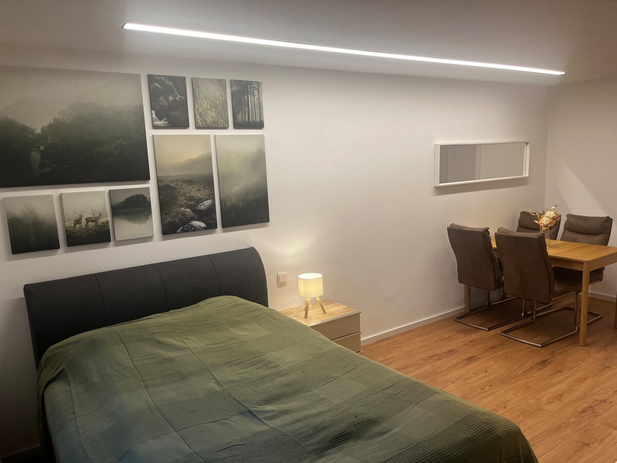 🌷Bienvenue 🌷 Dans notre petit logement privé dans la zone industrielle ! Au-dessus de notre entreprise, une petite oasis de bien-être vous attend - idéale pour les couples en quête de détente. Profitez de la vue imprenable depuis le jacuzzi. Les fenêtres coulissantes peuvent toutes être complètement ouvertes. Laissez le quotidien derrière vous et profitez du temps à deux 🥂 * Veuillez noter que la connexion Internet n'est pas très stable en ce moment*