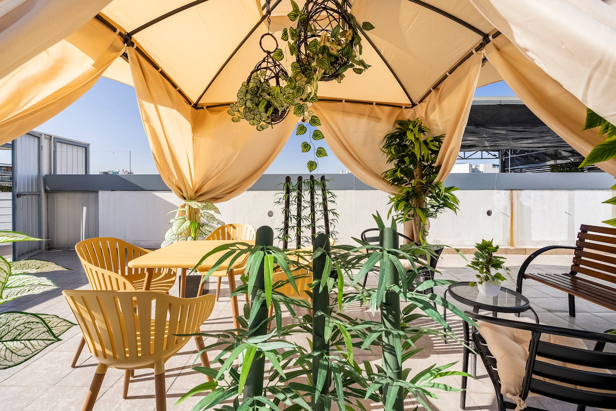 Studio central avec terrasse + climatisation + lit Queen Size et canapé-lit