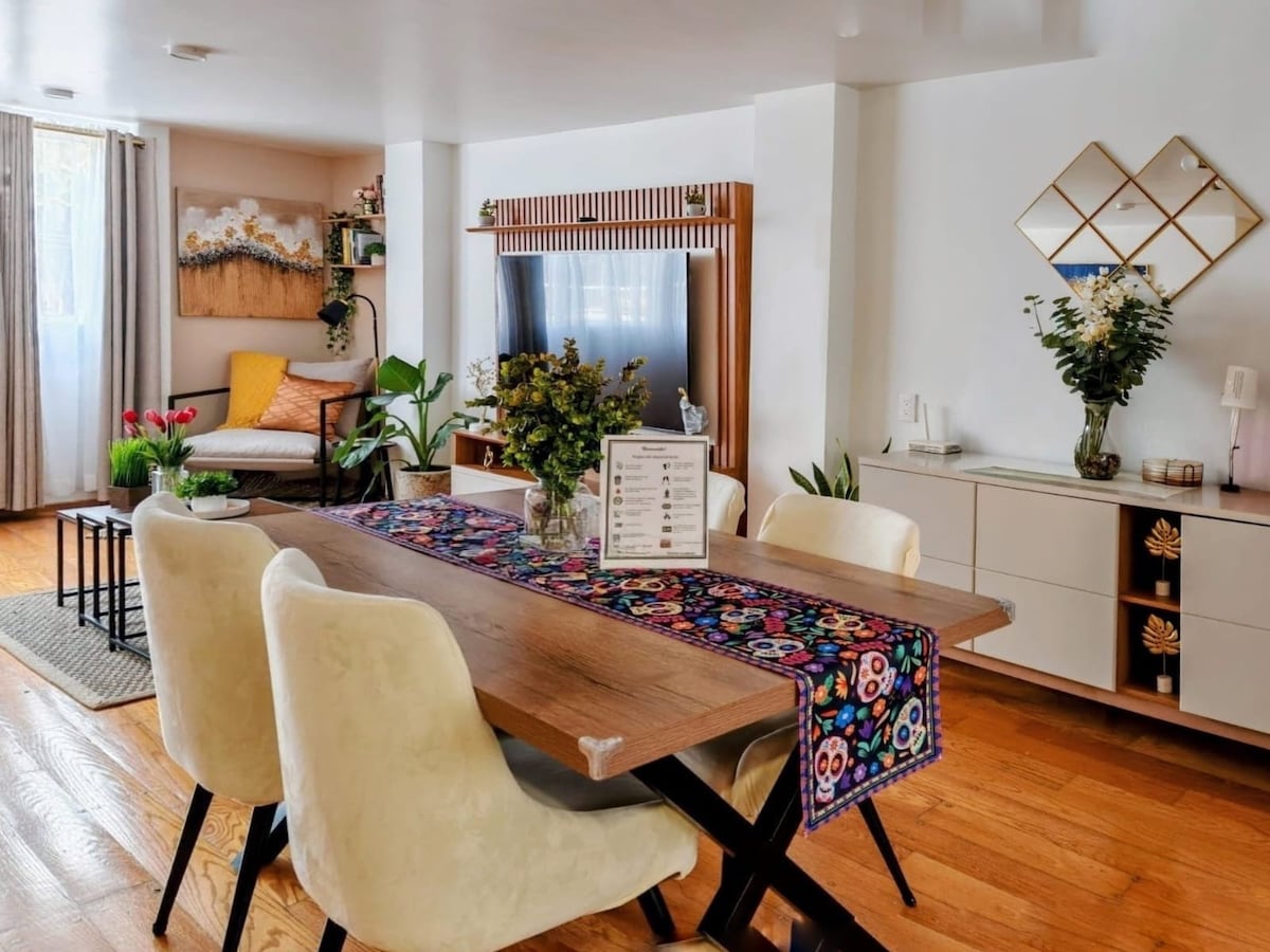 Vivez comme à la maison, appartement accueillant, confortable, avec tous les services et un excellent emplacement. Les deux chambres ont des rideaux Black out pour que vous puissiez vous reposer. Le quartier est très sûr et calme pour se promener. Vous aurez à quelques rues le beau Parc Hundido, où il y a plusieurs cafés et restaurants pour manger (tacos, sandwiches, sushis, etc.)