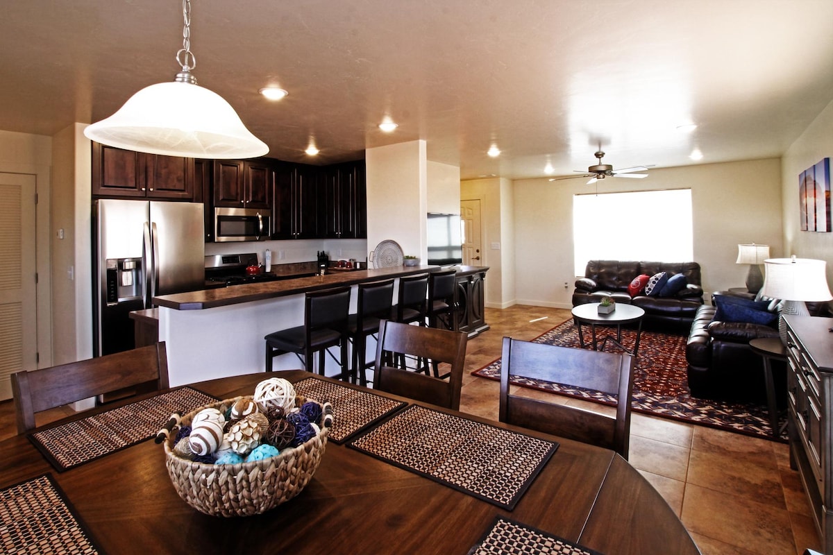 Découvrez votre escapade idéale à Moab dans cet élégant condo de golf. Profitez d'une vue imprenable sur le Moab Rim depuis un patio privé, avec barbecue et sièges extérieurs. Profitez d'appareils électroménagers en acier inoxydable mis à jour, d'une cuisine entièrement équipée et d'un accès à la piscine communautaire saisonnière. Parfait pour la détente ou l'aventure, avec un accès direct aux sentiers pour le vélo, le VUTT et la marche. Situé dans un complexe calme avec un parking, une allée et un garage pour une voiture. Idéal pour les petits groupes, les voyageurs en solo ou une escapade de travail à distance.