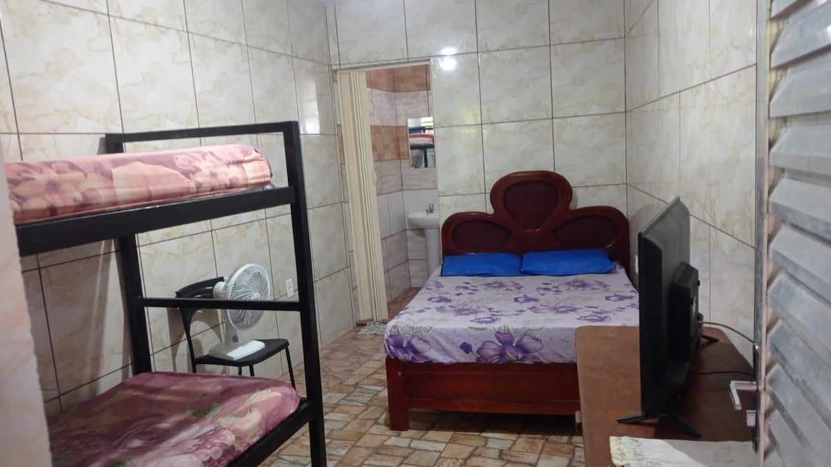 chambre d'une nouvelle auberge pouvant accueillir jusqu'à 4 personnes dans un lit double et un lit simple auxiliaire l'auberge est à 200 mètres de la magnifique plage de Guaiuba el Guaruja o.quarto dispose d'une salle de bains privative et vous pouvez utiliser la cuisine de l'espace commun nous avons un grand patio relaxant avec des filets et en pleine nature avec des singes oiseaux entre autres l'auberge fait face à une forêt dense de très verdoyant et de com.varios animas sauvages profitez de passer des jours à relajar