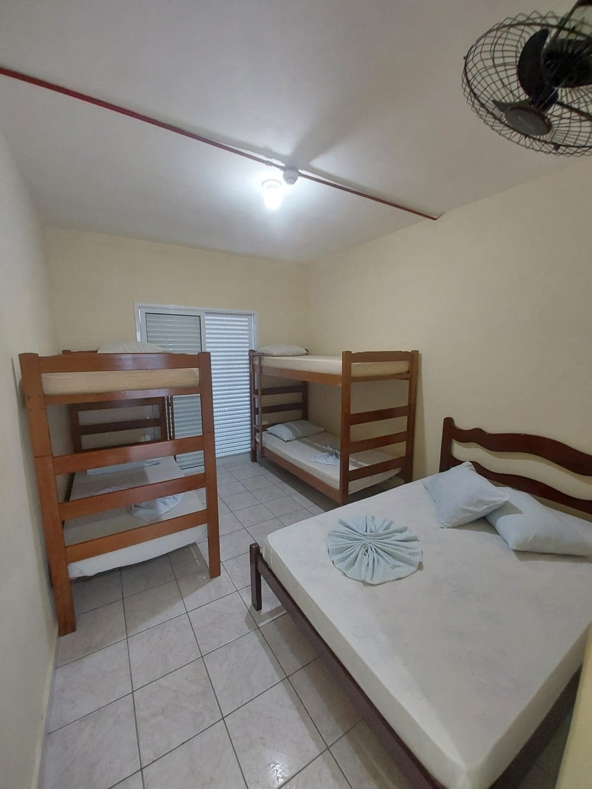 A suíte acomoda até 4 hóspedes em uma cama de casal e uma beliche, tem banheiro completo e privativo, frigobar e ventilador de teto.