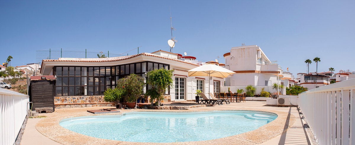 Casa Bonita, une superbe maison jumelée moderne avec piscine privée, terrasse sur le toit et vues incroyables. Un appartement de 2 chambres au rez-de-chaussée avec terrasse privée et buanderie adjacente, une terrasse sur le toit à l'étage + piscine privée, un coin bronzage, une zone barbecue, une table à manger et une détente, parfait pour profiter de l'incroyable vue sur la montagne et la mer. À seulement 15 minutes en voiture de Maspalomas et de la plage, mais totalement paisible. *Consultez notre autre annonce, y compris une chambre supplémentaire pour les grands groupes ou plus d'espace.