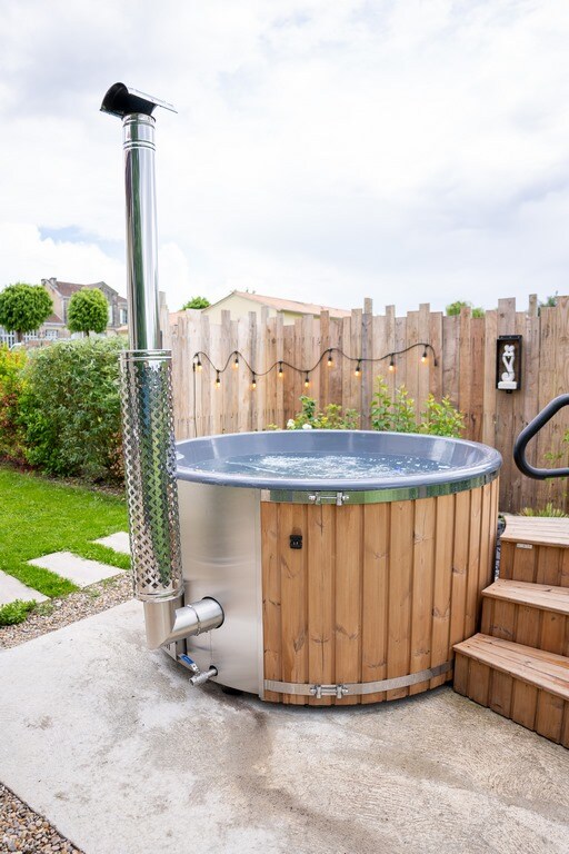 Maison lumineuse et indépendante à 5 min en voiture de toutes commodités avec jaccuzi : bain nordique Pour résumé, la maison a Une grande pièce de vie ,cuisine toute équipée Une chambre toute aussi grande avec son coin bureau pour un espace (wifi) Une Salle d’eau lumineuse et fonctionnelle (receveur de douche extra plat, WC suspendu, meuble vasque intégrant un lave-linge) Terrasse Jardin privatif stationnement privé, barbecue Equipement bébés sur demande (lit parapluie, chaise haute)