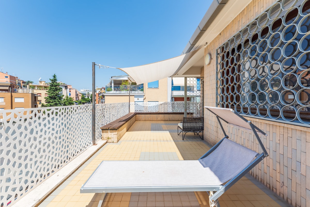 Laissez-vous éblouir par la lumière romaine dans cet appartement aux lignes légères et rêveuses. Le souci du détail se reflète dans la capacité d’atteler la lumière entre les espaces et les meubles, pour en faire un confort souriant et recueilli. Penthouse au septième étage d’un élégant immeuble situé dans le centre de Rome avec une grande terrasse donnant sur le parc de Monte Mario et d’où vous pourrez admirer la coupole de Saint-Pierre. Wifi ultra rapide. Pas d’enfants Check in 21 h/23 h Extra 50 € . Pas de check-in après 23 h