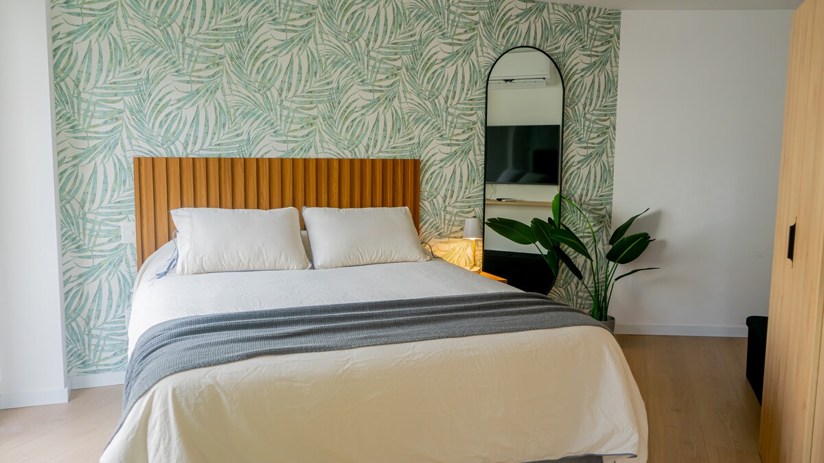 Chambre studio recyclée (25 m²) à 3 pâtés de maisons de la mer et à 5 du centre. Il dispose d'une petite cuisine avec une cuisinière à gaz, un mini-bar et tous les ustensiles nécessaires pour cuisiner. En plus du linge de maison et de la climatisation (chaud-froid). Bureau pour travailler. Salle de bain attenante. Il dispose d'une entrée indépendante, accessible par un hall de distribution. 3ème invité non admis (ni bébés de moins de 2 ans)