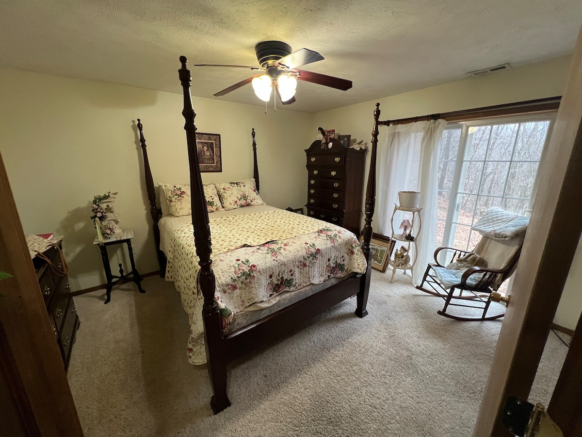 Maison d'hôtes relaxante dans un cadre rural paisible avec un troupeau de cerfs locaux qui vient fréquemment. Proche de Shades et Turkey Run State Park et du Wabash College. Emplacement idéal pour le Covered Bridge Festival et les lieux de mariage. Nous vivons sur place avec nos 2 labradors chocolat. La maison d'hôtes dispose d'une entrée privée et d'une terrasse extérieure privée face aux bois. Tout l'espace de vie est accessible aux personnes à mobilité réduite, y compris une grande salle de bain avec douche à l'italienne. Le nettoyage est conforme aux directives des CDC.