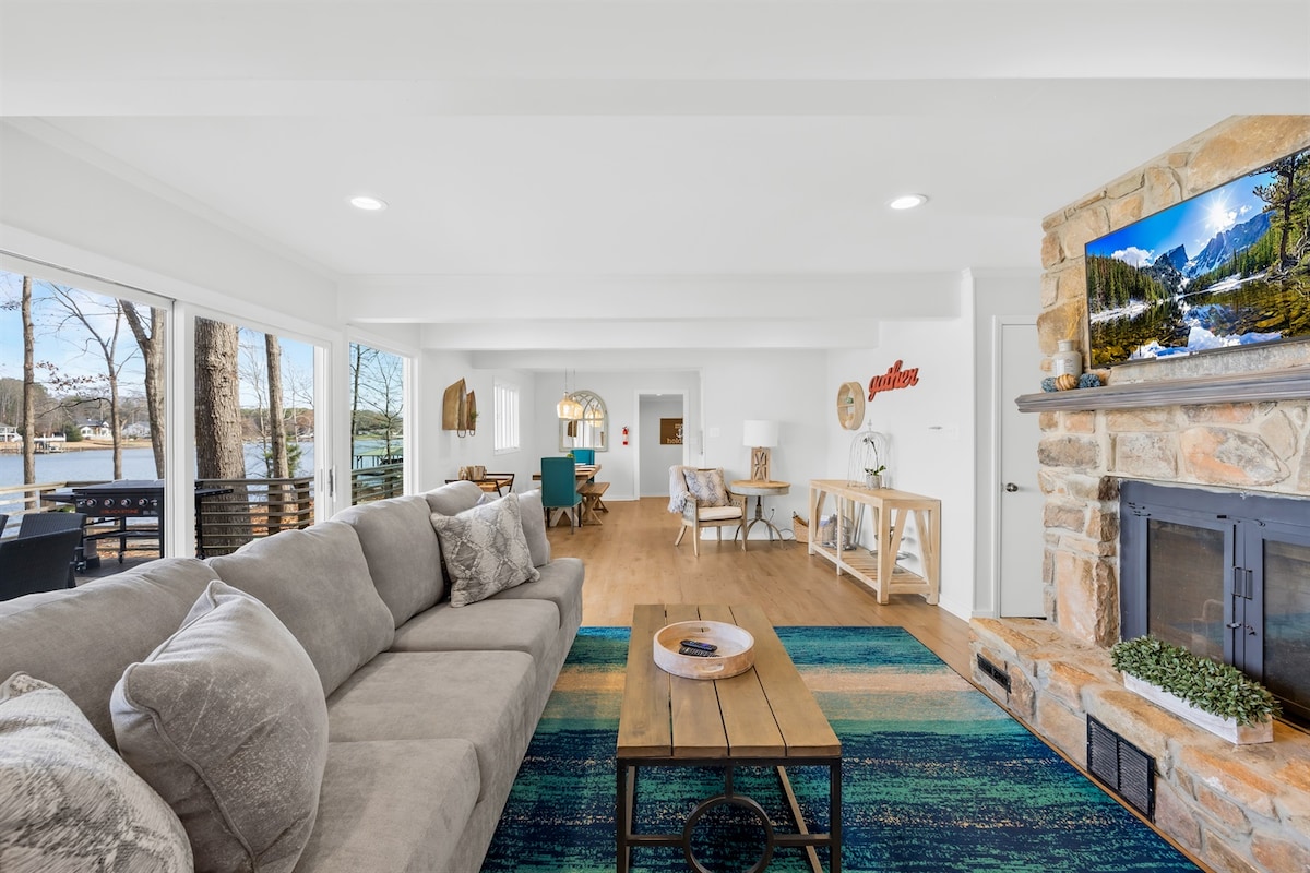Retraite au bord d'un lac avec kayaks, foyer et immense porche