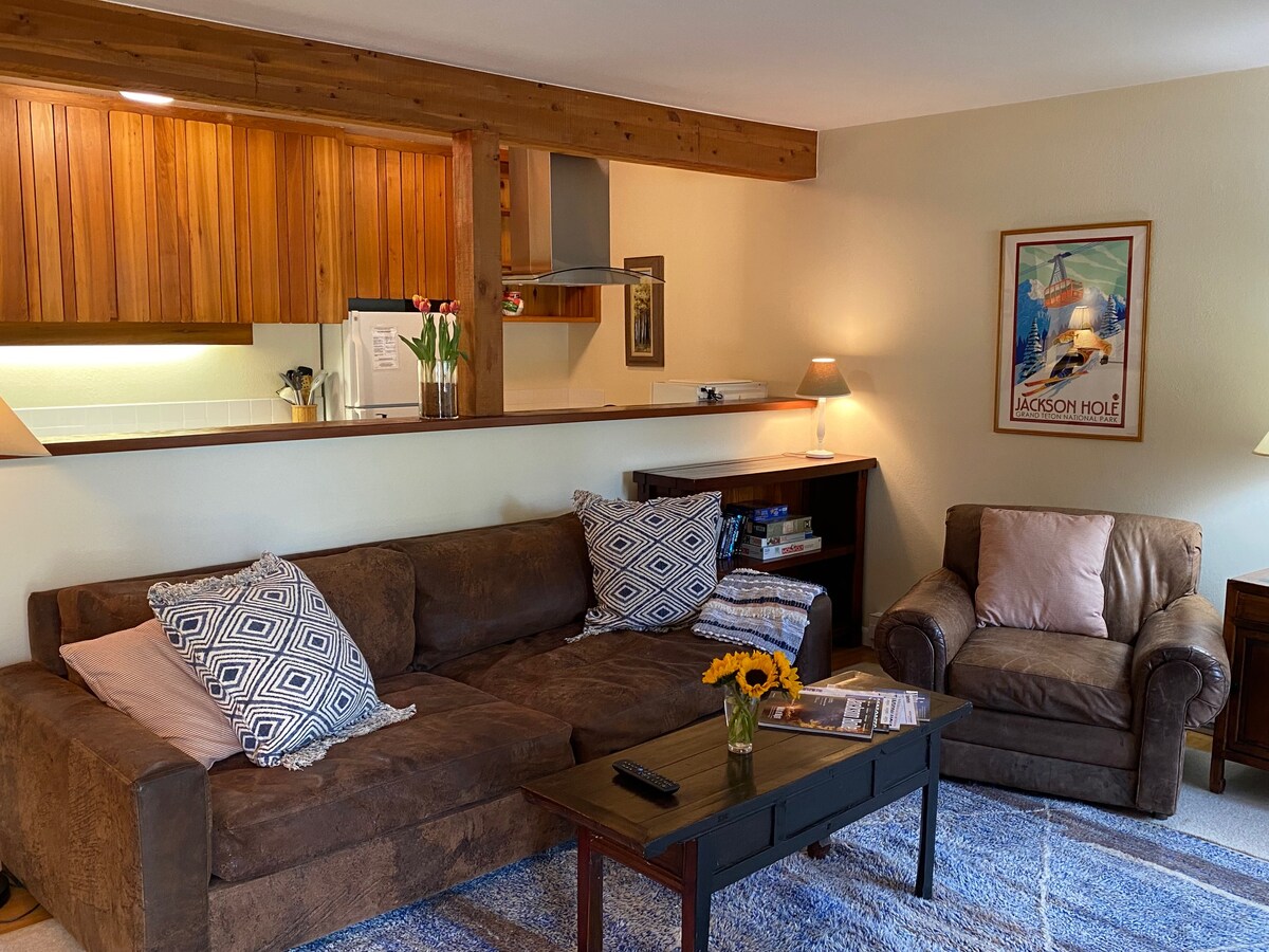 Appartement 1 chambre, 1 salle de bain, belle terrasse, cheminée à bois, télévision par câble, Wi-Fi, 4 couchages. L'appartement est situé à seulement 5 miles du parc national de Grand Teton et à seulement 4 miles de la station de ski de Jackson Hole. Épicerie, restaurants, caviste, café sont accessibles à pied depuis le logement.