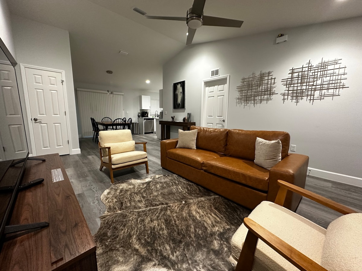 Stay close to the competition, but world's away from the stress of it all at Ambit Farms. Ambit Farms is located just five miles from WEC, but you'd never know it when you're here. Bold sunsets outline our numerous mature live oaks and green pastures. Our cozy one-bedroom has the equestrian at heart with all the comforts of home, and space for humans, horses, and hounds. Travel with your favorite four-leggeds with an easy commute to all major show venues and state parks. Compete + Relax with us.