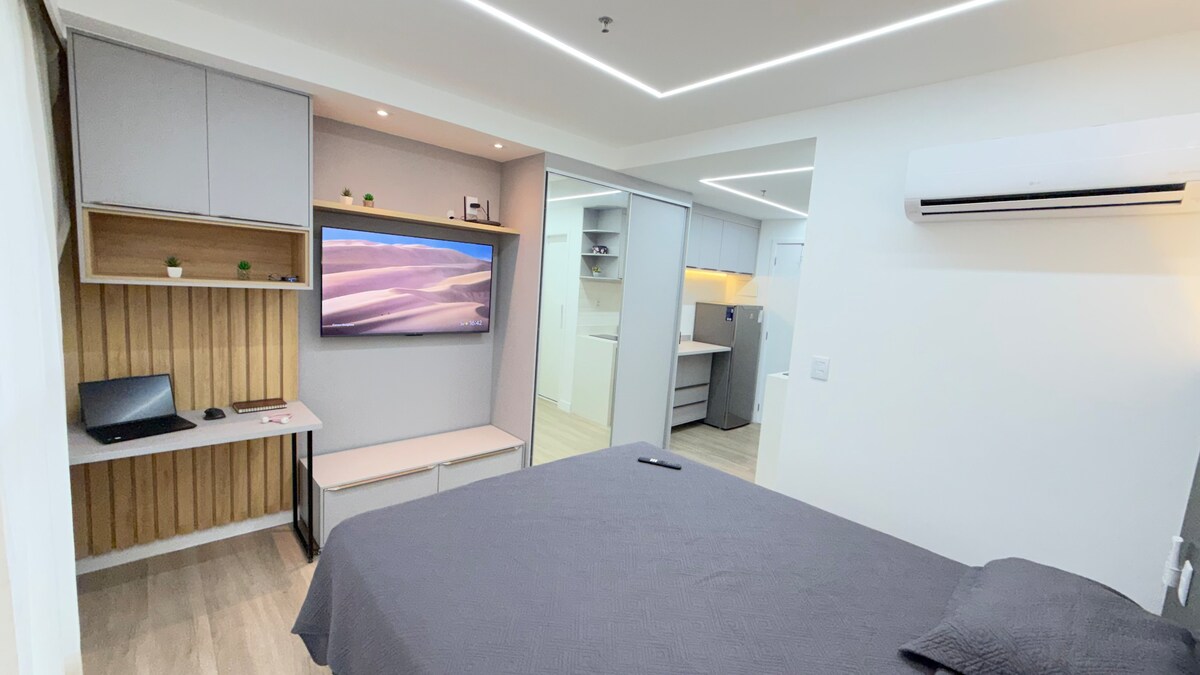 Détendez-vous dans notre studio calme, confortable, propre et équipé ! Le bâtiment dispose d'une piscine, d'un sauna et d'une place de parking couverte, mais il est également facilement accessible à ceux qui viennent en bus, car il se trouve du côté de l'avenue principale qui traverse Macaé. Le quartier est sûr, et le bâtiment est sur le front de mer, à quelques mètres de la plage de Campista et de la plage de Cavaleiros, avec une grande variété de restaurants, bars, snack-bars, boulangeries et pharmacies accessibles à pied. Très proche du supermarché Extra pour faciliter vos achats.