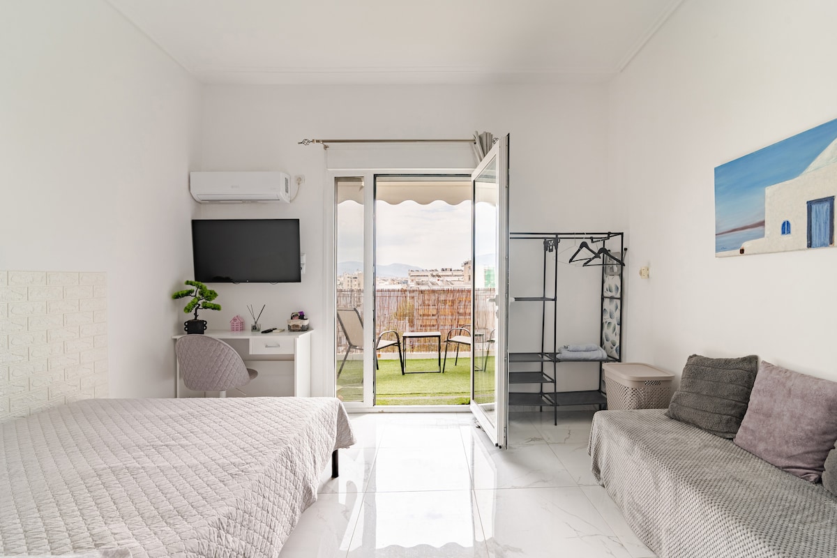 Perchée au dernier étage, cette retraite sereine offre des vues à couper le souffle et une atmosphère paisible. Conçu pour offrir un confort ultime, il est entièrement équipé de tout ce dont les voyageurs ont besoin. Profitez du calme, détendez-vous sur le balcon et admirez la beauté d'Athènes d'en haut. Un havre de paix parfait pour ceux qui recherchent la tranquillité tout en restant près du cœur de la ville.