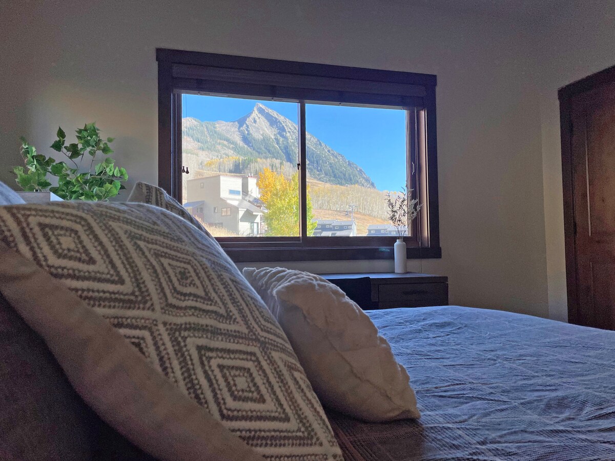 Ce logement d'angle de deux étages, deux chambres et deux salles de bain peut accueillir jusqu'à 6 personnes et ressemble plus à une maison qu'à une maison de ville ou à un condo. L'espace privé offre une belle vue orientée vers l'ouest sur la ville de Crested Butte en contrebas, Oh Be Joyful Range, Mount Emmons et Red Lady Bowl. D'immenses baies vitrées, une terrasse ensoleillée avec des chaises de ski Adirondack faites maison en été et en automne, une pelouse privée et un foyer au gaz confortable : l'endroit idéal pour l'après-ski avec les amis et la famille. Les couchers de soleil sont spectaculaires.