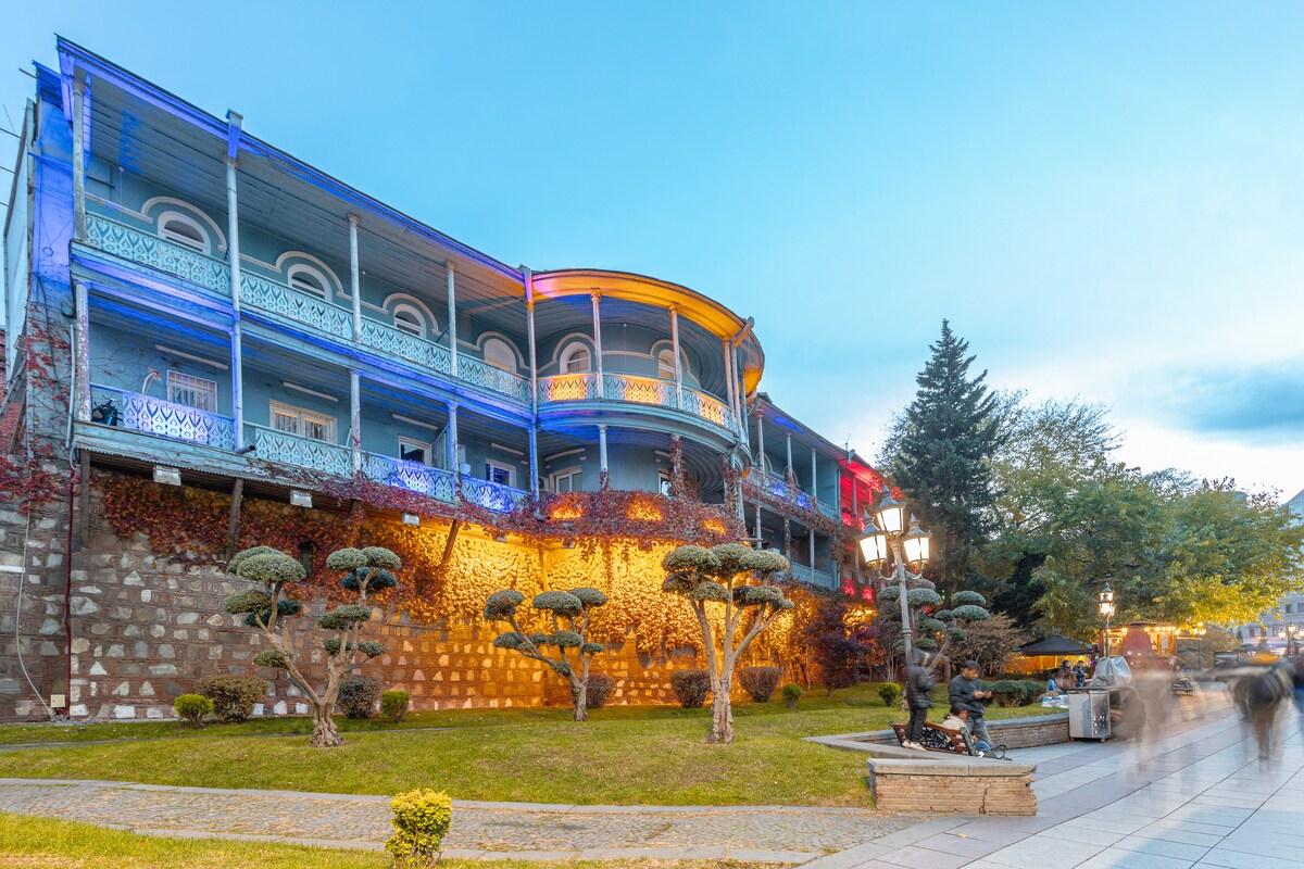 Bienvenue à l'Art Hotel Home, un hôtel de charme de 7 chambres au cœur de la vieille ville historique de Tbilissi. Cette chambre de luxe est parfaite pour 2 personnes et comprend un balcon. Les voyageurs peuvent également profiter de notre café sur le toit avec vue panoramique sur la ville.