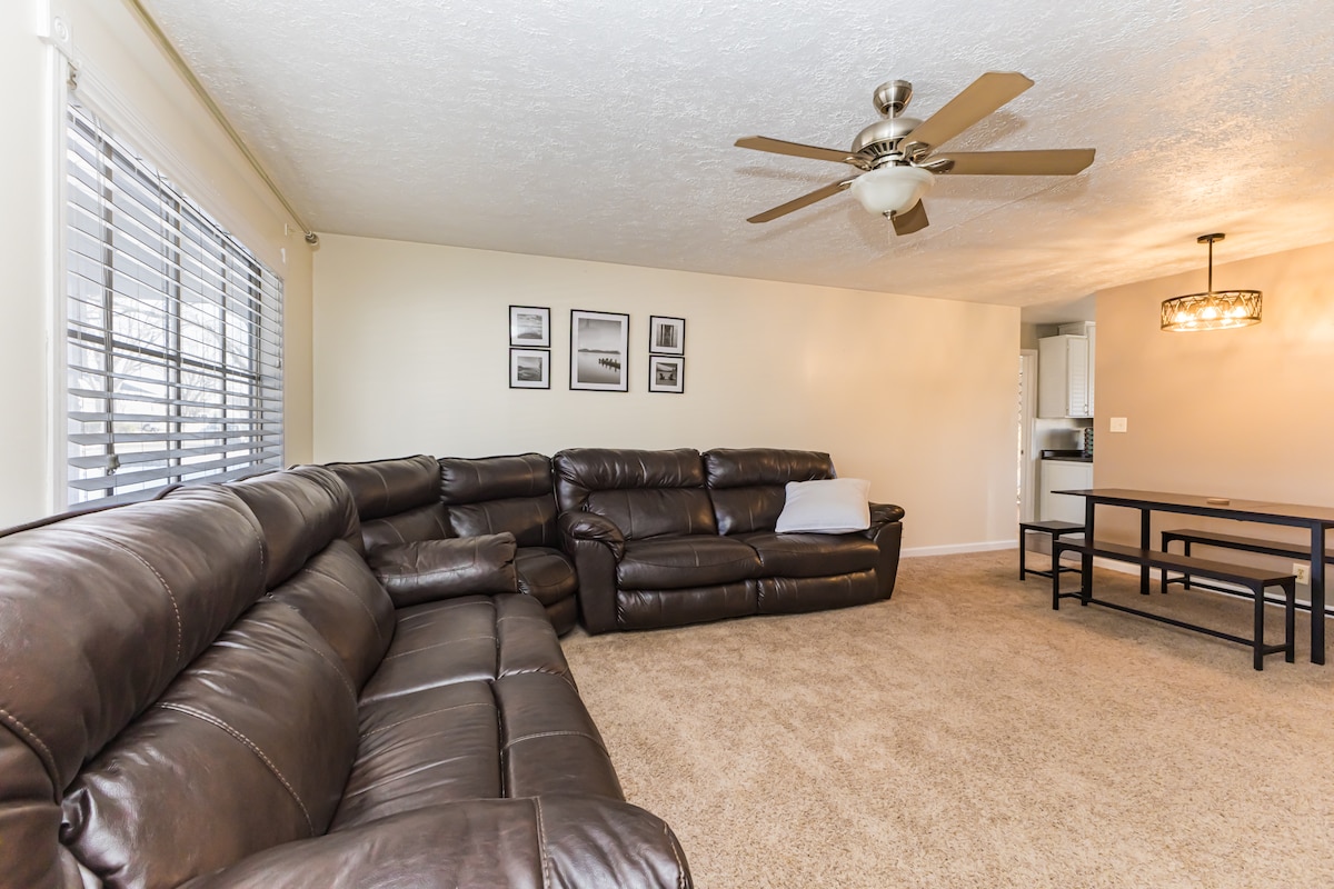 Maison spacieuse et confortable à quelques minutes de Ball State University, de l'hôpital IU Health Ball Memorial et du centre-ville de Muncie — et à distance de marche du stade! Parfait pour les jours de match, les visites sur le campus, les séjours à l'hôpital ou les voyages d'affaires. Cour clôturée avec patio, sièges, foyer et jeu de poches. Comprend deux chambres avec très grand lit (dont un lit inclinable électrique), une chambre avec lits superposés modulables, une chambre avec meuble-lavabo, une cuisine complète, une buanderie, des serviettes de qualité hôtelière et un bar à café. Rue calme avec beaucoup de stationnements.