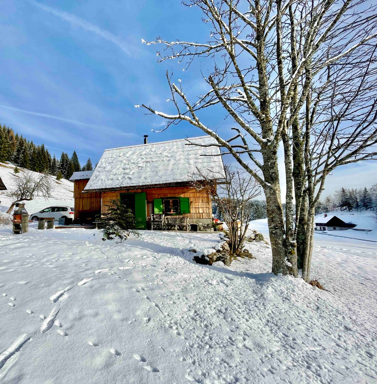 Vous avez besoin d'une escapade loin de la foule, des voisins et du bruit, mais à seulement 5 km de Bled ? Vous voulez vous réveiller avec les oiseaux et le chant de la rivière Sava ? Ce logement est parfait pour vous. La maison en bois est installée dans un grand jardin verdoyant, vous pouvez vous asseoir à l'extérieur, utiliser un barbecue, cueillir des légumes frais, de juin à septembre frais dans une petite piscine(3x3,5 m) et louer un vélo. Toute la région est parfaite pour la randonnée pédestre, le vélo, l'escalade et la pêche à la mouche - mon mari est un guide pour toutes les rivières en Slovénie et fournit tout ce dont vous avez besoin.