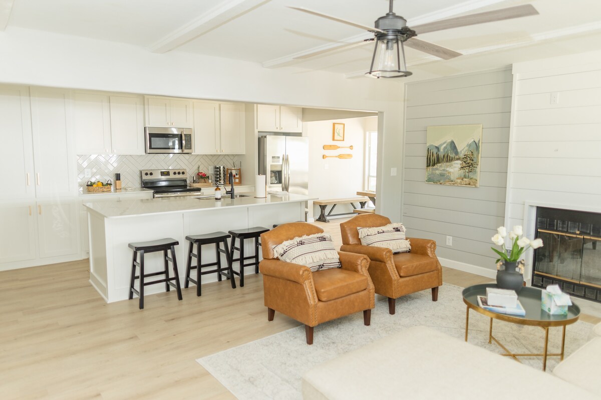 Entièrement rénové en juin 2023. Parfait pour 2 familles ou plus. 2 chambres principales en bas, chacune avec un lit King Size et une salle de bain complète. À l'étage, il y a deux chambres, une avec un lit Queen Size et une avec des lits superposés. Les chambres à l'étage partagent une salle de bain complète. Lancez votre bateau ou accédez au lac au bout de Landing Road (350 yards) ou à la rampe de mise à l'eau d'Eagle Bay (1 mile en voiture). Profitez du spacieux porche couvert et cuisinez sur le gril plat. Des kayaks peuvent être mis gratuitement à la disposition des voyageurs responsables.