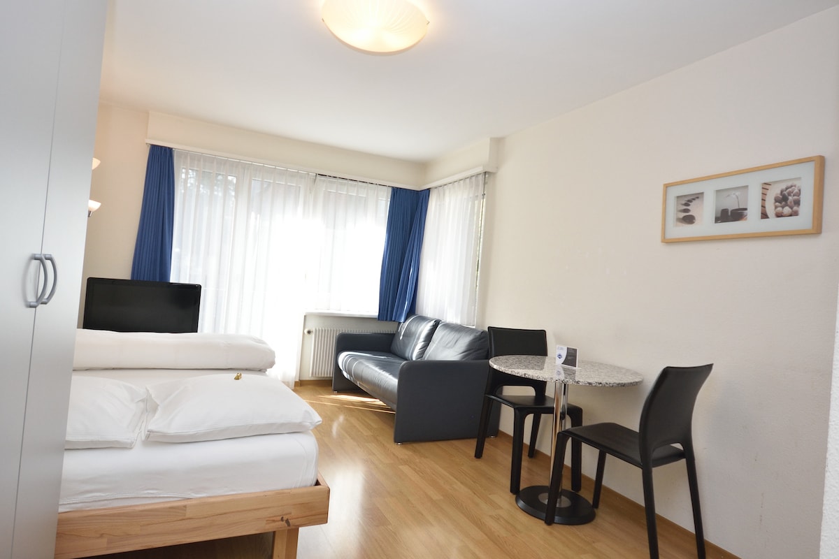 The studio is 12 minutes from Central Zurich via Tram 2 and 3, bus 72 and 33 to Albisriederplatz). It used to be part of the Crowne Plaza Hotel (next door). There is a swimming pool and Fitness Gym next door (additional cost). The studio has 2 single beds which can be extended for 3 or 4 people. Brand new kitchen and full of kitchen accessaries. There is no TV and no sofa. Migros (Swiss grocery) is 1 minute walk away