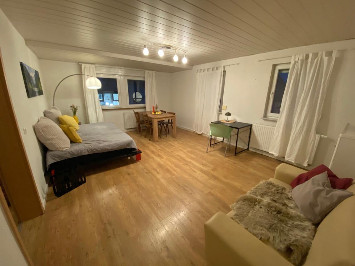 Appartement lumineux et moderne situé au centre et pourtant au calme. Salon et chambre à coucher ouverts avec lit king size, grandes fenêtres, cuisine entièrement équipée. Wi-Fi inclus, parking, auto-enregistrement possible. Proximité du centre-ville, accès facile, commerces à distance de marche. Distances à pied/vélo : Gare à 1,1 km, Z*b 900m, Piscine 650m, Usine Bosch 4 et centre de formation Bosch 1 km Centre ville 1,3 km Parfait pour les couples, les voyageurs en solo ou les voyageurs d'affaires.