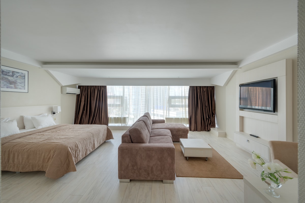 La chambre fait 20 m ². La chambre dispose d'un réfrigérateur, d'un four à micro-ondes, d'une bouilloire électrique, d'une cuisinière électrique, d'un ensemble de plats et de couverts, d'un coin repas, d'une télévision avec télévision par câble, d'une connexion Wi-Fi, de la climatisation, d'un balcon (chaque balcon dispose de meubles de jardin où vous pourrez vous détendre et prendre un en-cas), d'une salle de bain moderne avec douche. La chambre Standard PLUS comprend un lit transformateur double, qui, à la demande du voyageur, peut s'étendre en deux lits simples, et un canapé confortable.