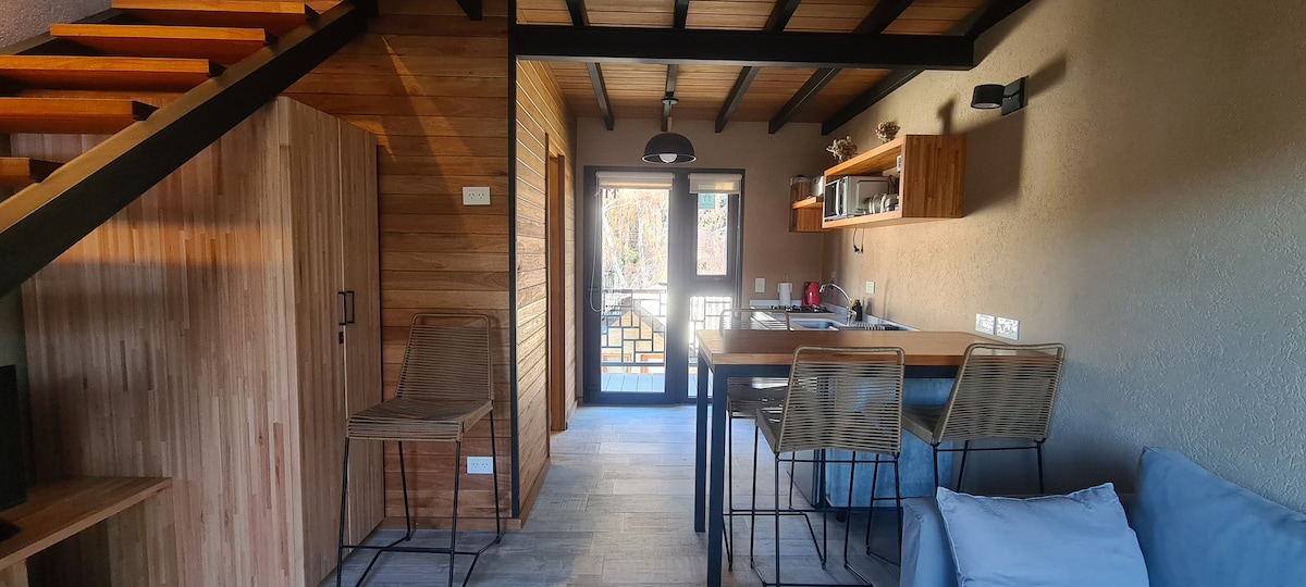 Loft d'architecture moderne, avec des espaces intégrés, de grandes et grandes fenêtres qui permettent de profiter de l'intérieur de l'imposante nature. Être, cuisine et salle à manger intégrés, cuisine entièrement équipée pour 5 personnes Dans le salon, il y a un futon qui se transforme en lit 2 places plus un lit simple. La mezzanine dispose d'un sommier 2 places .