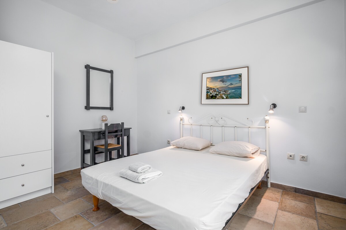 Studio fraîchement rénové à Armenistis, situé dans le centre historique du village et à côté de la plage des villages. Le supermarché, les restaurants et tout ce dont vous avez besoin sont accessibles à pied. Le wifi, la climatisation et une cuisine entièrement équipée en font un lieu de vacances idéal. Comme ma famille a ses propres jardins et le poulet, nous fournirons des friandises fraîches pour accompagner vos repas.