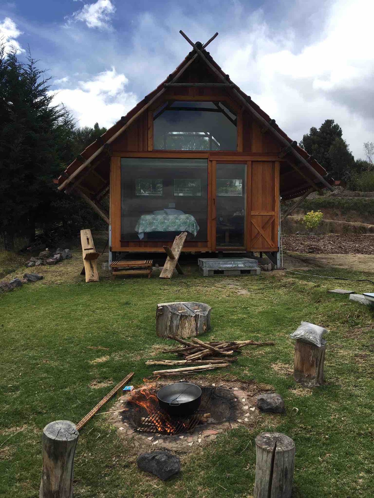 Cabane en verre dans la montagne située dans le volcan Ilaló dans la vallée de Tumbaco, à 7 minutes de la Ruta Viva, à 20 minutes de Quito, à 20 minutes de l'aéroport de Quito. Il dispose d'un lit queen size, d'une baignoire chaude pour 2 personnes, de 2 salons, d'une salle de bains privée, d'une cuisine, d'un minibar (réfrigérateur), d'une salle à manger, d'un espace barbecue, d'une douche avec vue sur la montagne et la vallée de Tumbaco. 1000 mètres de jardins, 3000 mètres de sentiers typiques de la montagne. Observation des lucioles, des papillons, des hiboux