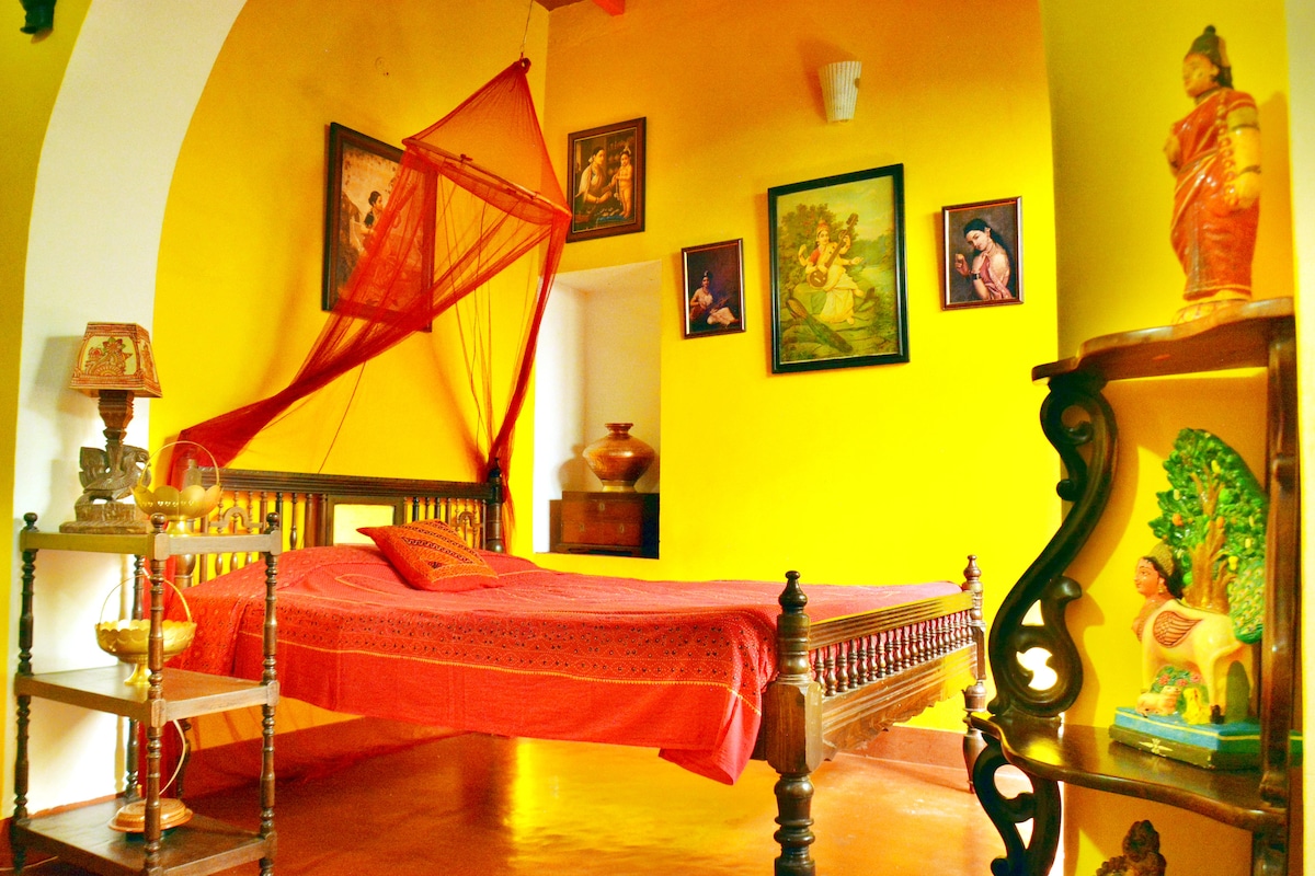 Votre maison loin de chez vous à Auroville a été décorée avec goût sur le thème de Chettinad. Chaque coin de notre maison est digne d'Instagram avec des intérieurs colorés, de l'art kolam, une décoration ancienne et plus encore. Le 1BHK peut accueillir confortablement jusqu'à 4 personnes avec un lit suspendu et un canapé-lit dans le séjour. Il y a de nombreux restaurants à proximité, notre cuisine a été soigneusement équipée pour tous vos besoins - que ce soit pour préparer une omelette rapide ou un repas indien complet. Asseyez-vous, détendez-vous et sirotez votre café.