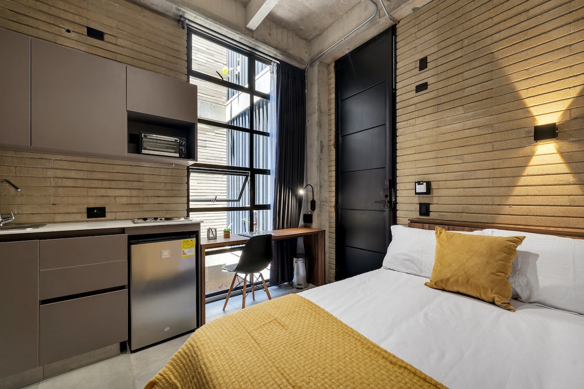Loft 43 Medellin Incroyable studio Idéal pour ceux qui aiment travailler de n'importe où. Il dispose d'un lit Queen Size, d'un bureau et d'une chaise de travail, d'une cuisine équipée, d'une salle de bain privée avec douche à eau chaude, d'une télévision de 43 po et d'une connexion WIFI. Les éléments de cuisine de base, vous pouvez les demander à la réception, à l'huile, au vinaigre de sel et au poivre, vous pouvez l'acheter dans un magasin à proximité. Pour vous inscrire, vous devez présenter une pièce d'identité physique valide.
