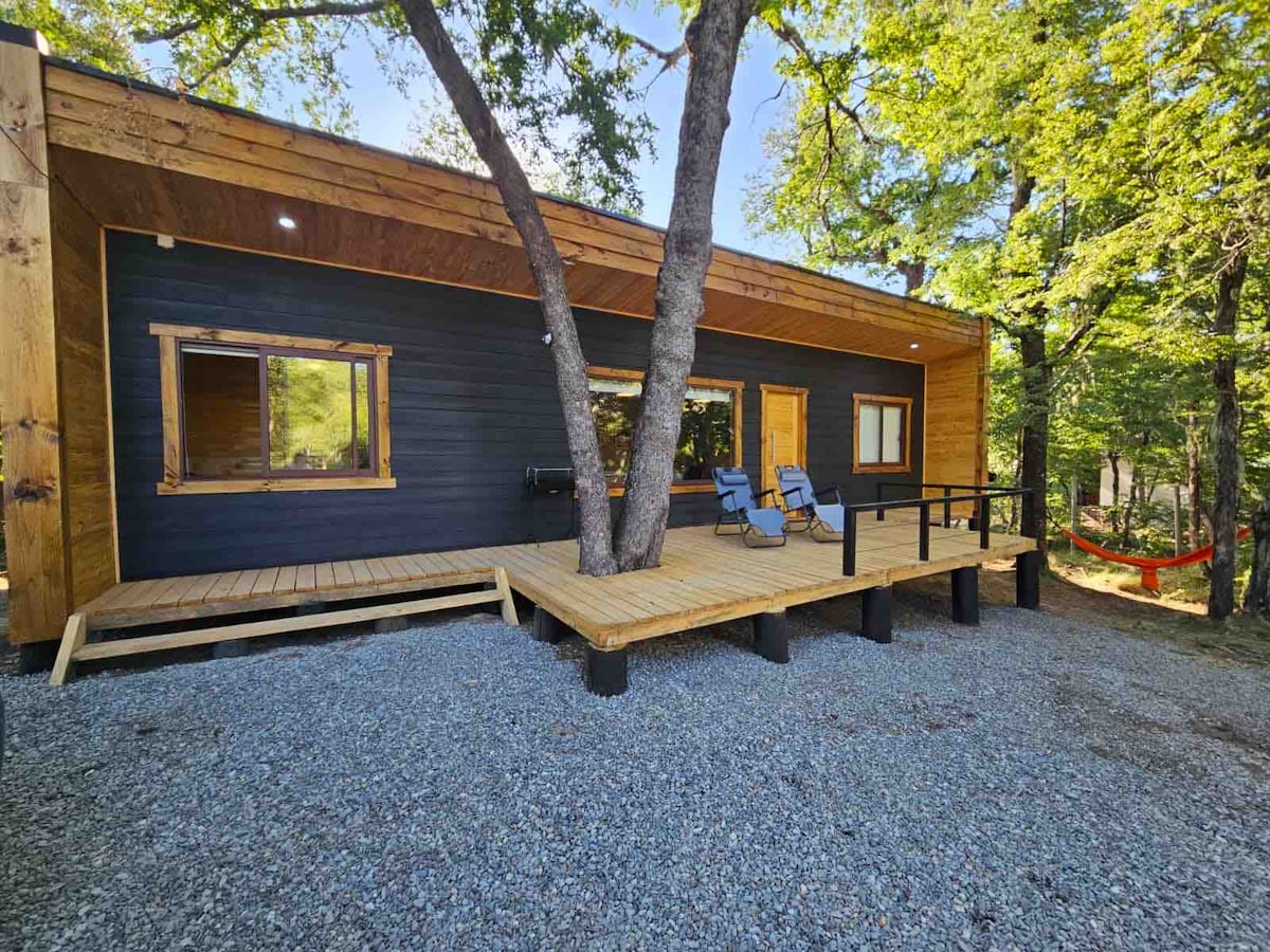 Seule cabane immergée dans un demi hectare (5 000m2) de forêt indigène privée avec mini chemin de fer, PISCINE (été) et jeux à L'USAGE EXCLUSIF des clients. WIFI fibre/ 2 SMART TV(HD c Pack DISNEY+/ESPN ETC.)/DirectTV/Eau potable/Gaz/Bois/Serviettes/Draps/machine à laver Capacité p/ 4. 1D. double et 1D. avec 2 lits de 1 place. ; salle à manger-cuisine (entièrement équipée), poêle à bois, 1 salle de bain, barbecue avec barbecue. Proche du centre de Los Lleuques et 25 km de Nevados de Chillán