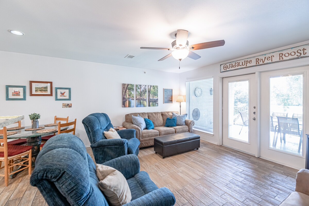 Situé dans le quartier historique de Gruene au Texas, avec une vue imprenable sur la rivière Guadalupe depuis votre balcon privé. Cet appartement spacieux de trois chambres a tout ce dont vous aurez besoin pour vous sentir comme chez vous avec Internet haut débit, la télévision par câble, un lave-linge et un sèche-linge. Niché au bord de la rivière Guadalupe, vous pourrez profiter d'un accès direct à la rivière, vous détendre au bord de la piscine avec cascade ou vous promener pour profiter de tous les commerces, restaurants, bars et de la vie nocturne que le quartier historique de Gruene a à offrir. Nous avons hâte de vous accueillir !