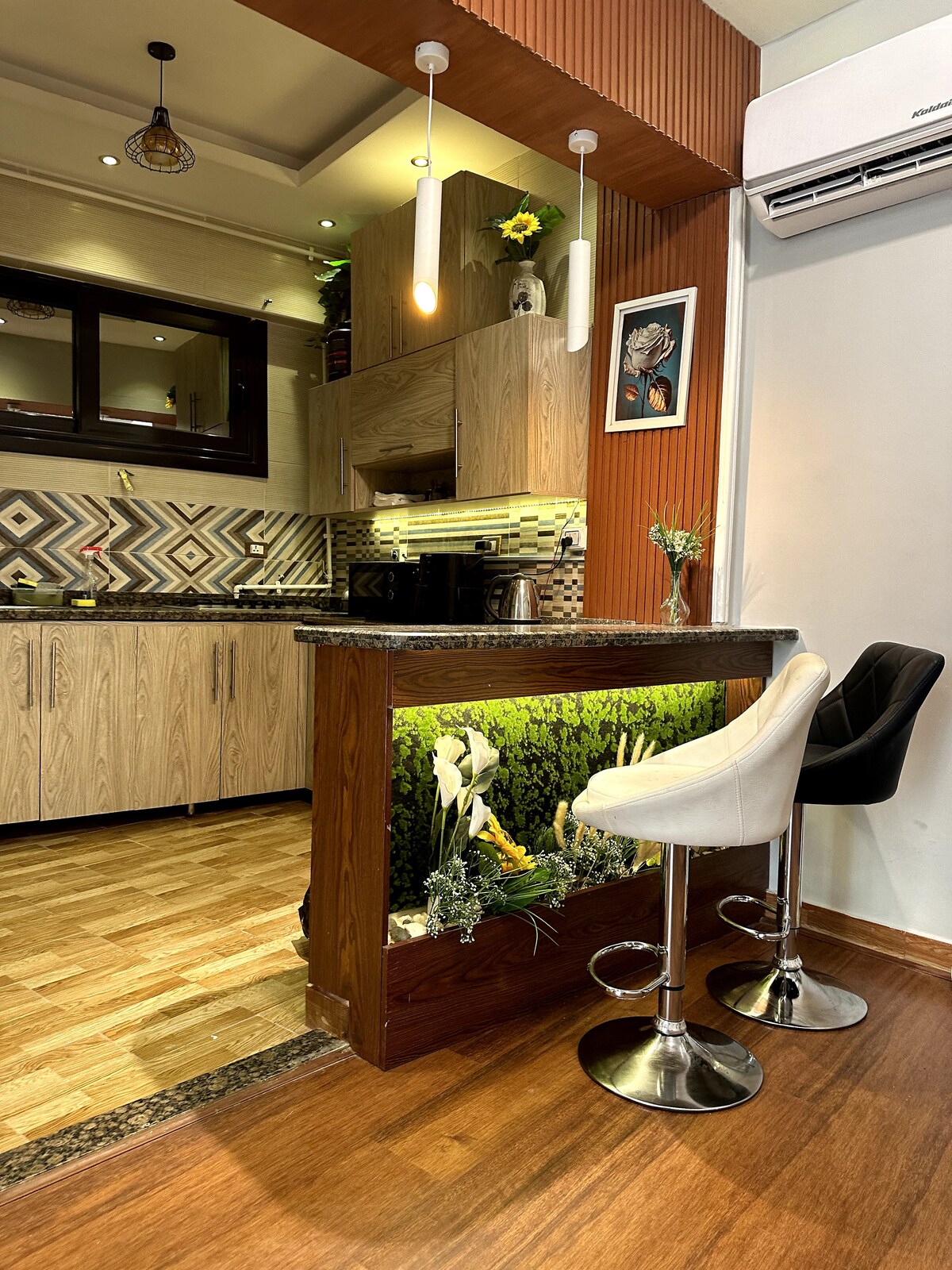 Une ambiance comme à la maison, avec des normes dignes d'un hôtel. Découvrez un appartement élégant d'une chambre situé dans un quartier privilégié du Nouveau Caire, à proximité de l'AUC, de l'EDNC, de la voie navigable et de la nouvelle capitale. Le salon est meublé d'un canapé confortable, complété par une télévision intelligente et une connexion Wi-Fi pour vous garder connecté tout au long de votre séjour. La chambre à coucher offre une évasion sereine, avec des lits jumeaux recouverts de draps de qualité hôtelière, assurant des nuits reposantes, 2 salles de bains, un coin repas, une kitchenette entièrement équipée et la climatisation.