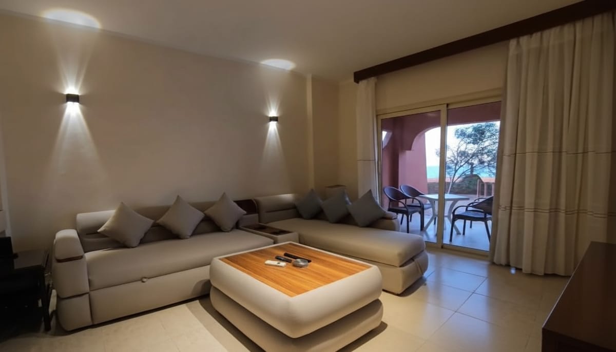 Appartement de deux chambres, dont une chambre principale, avec une vue dégagée et une belle vue sur le jardin. L'appartement est fini et meublé dans un style moderne, offrant confort et élégance. Elle comprend 3 salles de bains, une cuisine entièrement équipée, un espace de réception spacieux et un balcon donnant sur le jardin. Idéal pour un séjour de détente dans un environnement calme et bien entretenu.