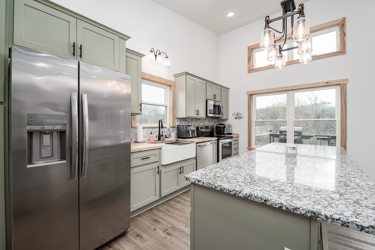 Bienvenue à Stone Creek, un domaine privé de 3 acres idéalement situé à quelques minutes de Louisville, KY. C'est l'escapade ultime ! En entrant dans les lieux, vous trouverez une porte de sécurité en fer personnalisée nécessitant un accès codé. Stone Creek dispose de plus de 2500 pieds carrés d'espace de vie de luxe complet avec une cuisine complète, une buanderie et un bureau. Les invités auront pleinement accès au terrain, y compris au jacuzzi, au foyer et aux nombreuses terrasses et patios couverts. Escapade romantique parfaite ou retraite pour plusieurs personnes.