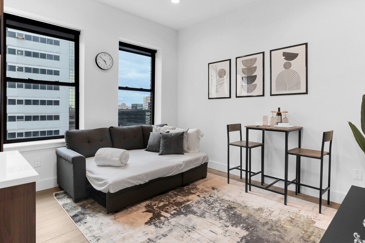 Studio loft moderne et élégant au cœur de Newark. À quelques minutes de l'aéroport EWR, de la gare de Newark Penn et des principales autoroutes, rejoignez New York en 25 minutes. À distance de marche du Prudential Center et du NJPAC, et à proximité du MetLife Stadium. Cette retraite spacieuse dispose de hauts plafonds, de finitions élégantes et d'un accès à un toit avec une vue imprenable sur l'horizon de Newark et de New York. Parfait pour le travail ou le plaisir avec tout l'essentiel pour un séjour confortable et connecté.