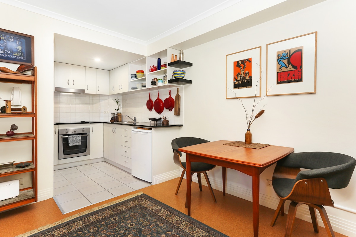 Chambre : * Lit Queen Size. Relevez et abaissez la tête et le pied du lit indépendamment en appuyant sur un bouton. * Télévision avec télécommande et chaînes gratuites * Ventilateur de plafond silencieux et climatisation * Toilettes et douche attenantes avec eau chaude à gaz en ligne Salon : * Kitchenette avec plaque à induction, micro-ondes, petit réfrigérateur, lave-vaisselle, machine à café Nespresso et grille-pain * Petit coin salon avec table à manger et trois chaises. * Télévision avec télécommande et chaînes gratuites. * Système d'accueil audio personnel adapté à l'iPod/iPhone. * Lit simple pliant disponible pour les voyageurs supplémentaires (en supplément) * Climatisation. Autres éléments : * Entrée privée sécurisée sans clé * Accès Wi-Fi gratuit. * Propriété non-fumeur * Le linge et les serviettes sont fournis. * Accès à une petite terrasse ensoleillée. * Séjours courts bienvenus (min. 2 nuits) * À quelques minutes de la rue animée King St et * Nombreuses laveries et restaurants à proximité * Stations de St Peters, Erskineville et Newtown accessibles à pied. * Deux adultes maximum. * Toutes les demandes raisonnables sont prises en compte. Terrasse extérieure partagée avec les propriétaires. La terrasse n'est pas adaptée aux enfants. De nombreuses laveries locales à proximité. L'appartement est privé et est relié à la résidence. Laissez un message sur le tableau blanc, appelez, envoyez un SMS ou frappez à notre porte si vous avez besoin de quoi que ce soit pour améliorer votre séjour. Situé dans la banlieue d'Erskineville, à cinq kilomètres du centre-ville, l'appartement se trouve à deux pas de l'emblématique King Street, qui abrite des restaurants, des pubs et des boutiques. Les stations Erskineville, St. Peters et Newtown sont à quelques pas seulement. Beaucoup de transports à proximité. Facile d'accéder à la ville, en bus ou en train. À quelques minutes à pied de la gare de St Peters, à 10 minutes des gares d'Erskineville et de Newtown. Bus à deux pas sur King Street. Bel espace calme avec entrée privée.