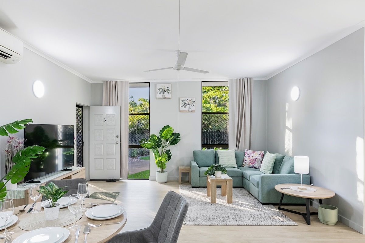 Profitez d'une expérience élégante dans ce logement paisible et central. Convient à 2 couples ou à la famille. Entièrement climatisé avec 2 chambres, 1 lit queen size avec salle de bain attenante, 1 lit double avec lit pliant simple. 2ème salle de bain séparée avec douche. Grand balcon avec ventilateur d'extérieur pour dîner ou se détendre. Comprend 2 aires de stationnement sécurisées. À distance de marche de l'estran, de la piscine publique, des marchés de restaurants et des magasins. À 10 minutes en voiture de l'aéroport et à 15 minutes de Darwin City. À proximité des arrêts d'autobus.