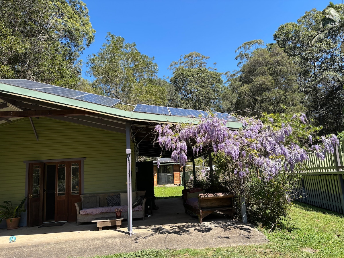 Niché dans les collines de la « Rainbow Region » qui était d'une importance culturelle pour le peuple indigène Bundjalung. Passez votre temps à vous détendre et à admirer la beauté de notre « Coffee Cottage ». Ruisseau permanent à travers les arbres, que l'on peut entendre et voir depuis la terrasse. Réveillez-vous avec les sons apaisants des oiseaux. Observez les étoiles la nuit avec le scintillement des vers luisants en arrière-plan. Baignoire extérieure sur la terrasse. Cheminée interne pour vous aider à rester au chaud. Nimbin à 12 minutes, Lismore à 25 minutes.