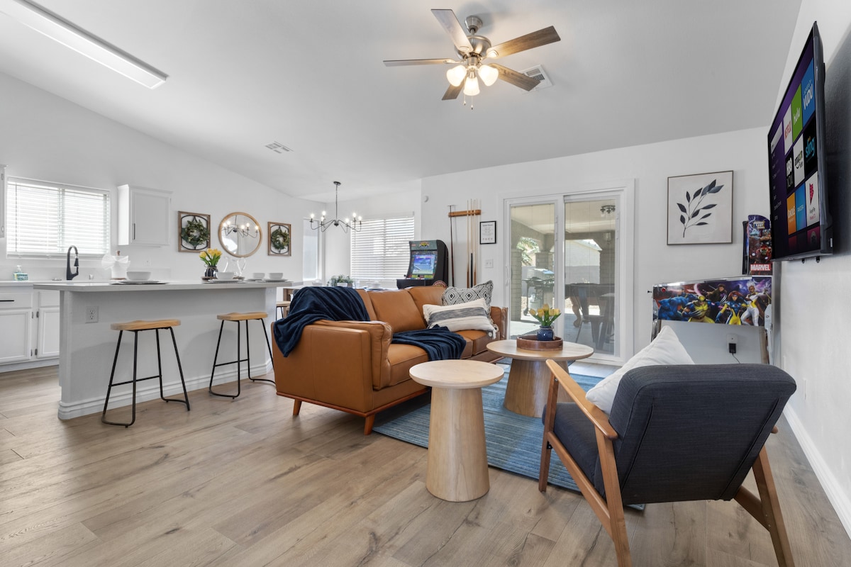 Maison de Las Vegas fraîchement rénovée avec une oasis de piscine de villégiature, des jardins avec foyer personnalisé, un nouveau jacuzzi Clearwater moderne avec plus de 100 jets et éléments aquatiques pour vous détendre et profiter, un patio avec barbecue et cuisine extérieure et une aire de jeux extérieure amusante ! Cette maison unifamiliale avec une casita est située à quelques minutes d'aventures en plein air, de l'excitation du Strip et des attractions locales bien-aimées. Profitez d'un style bohème moderne et décontracté avec des touches réfléchies pour vous assurer un séjour confortable et mémorable.