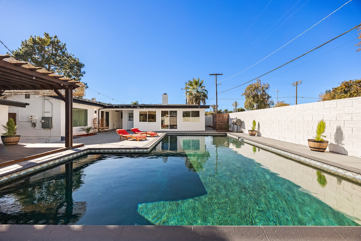 Come and enjoy a fully remodeled, spacious and fun filled pool home with indoor/outdoor living and a central location to everything LA has to offer! Home features all the modern amenities and touches you want when staying in a vacation rental! Spacious layout, comfortable seating, Heated Swimming Pool (addt'l $) Ping Pong + board games, BBQ, Coffee Corner, high end beds + bedding! At LAluxuryBnb we focus on creating memorable experiences for our guests!