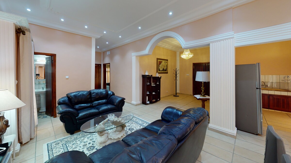 logement calme et spacieux adapté pour les familles , 4 chambres avec 3 douches plus une 5 dème petite chambre dedié à un agent de maison. En bas une suite avec salle de bain, un salon une salle a manger une cuisine avec four, une véranda et une grande course gardien habite dans une dépendance derrière, une réserve d'eau et un groupe électrogène. à l'étage 3 chambre donc une dédié aux enfant avec deux lits superposés une place.un salon, et une salle a manger. duplexe dans un quartier calme .