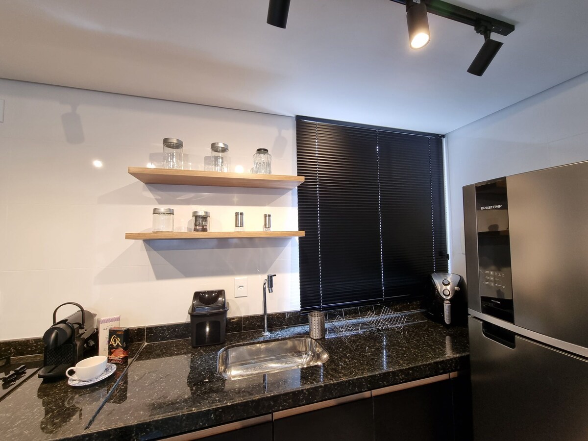 Equipado, SELF CHECK IN e CHECK OUT, fechadura eletrônica, WIFI, ar-condicionado, CAMA QUEEN SIZE, sofá, travesseiros ("da nasa", pluma e espuma), SMARTTV 58", geladeira, MICROONDAS, cooktop, CAFETEIRA, enxoval de primeira linha, utensílios de cozinha. Bem iluminado, poucos ruídos externos, excelente estadia privativa. ESTACIONAMENTO COBERTO, gratuito e com portão eletrônico, RECARREGADOR VEICULAR, academia, LAVANDERIA OMO self-service, coworking, piscina, sauna, portaria eletrônica e câmeras.