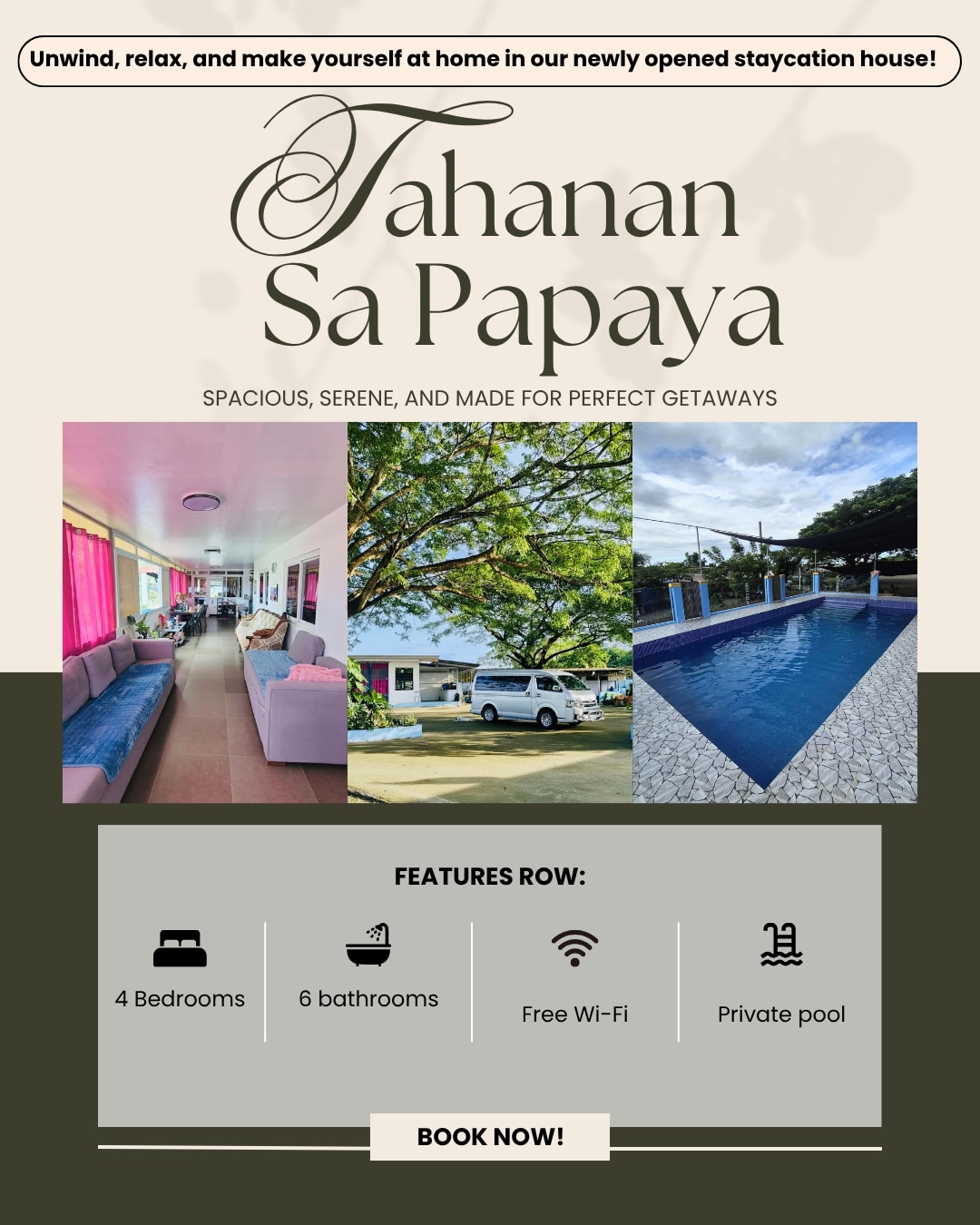 Vous planifiez une célébration ou une retraite d'entreprise? Tahanan sa Papaya Resort and Garden a l'espace parfait pour votre prochain grand événement! Que ce soit pour un petit groupe ou une activité de cohésion d'équipe, on rendra votre événement inoubliable. De plus, nous proposons maintenant une fourgonnette pratique pour les voyages organisés, ce qui rend le voyage de votre groupe fluide et sans stress!