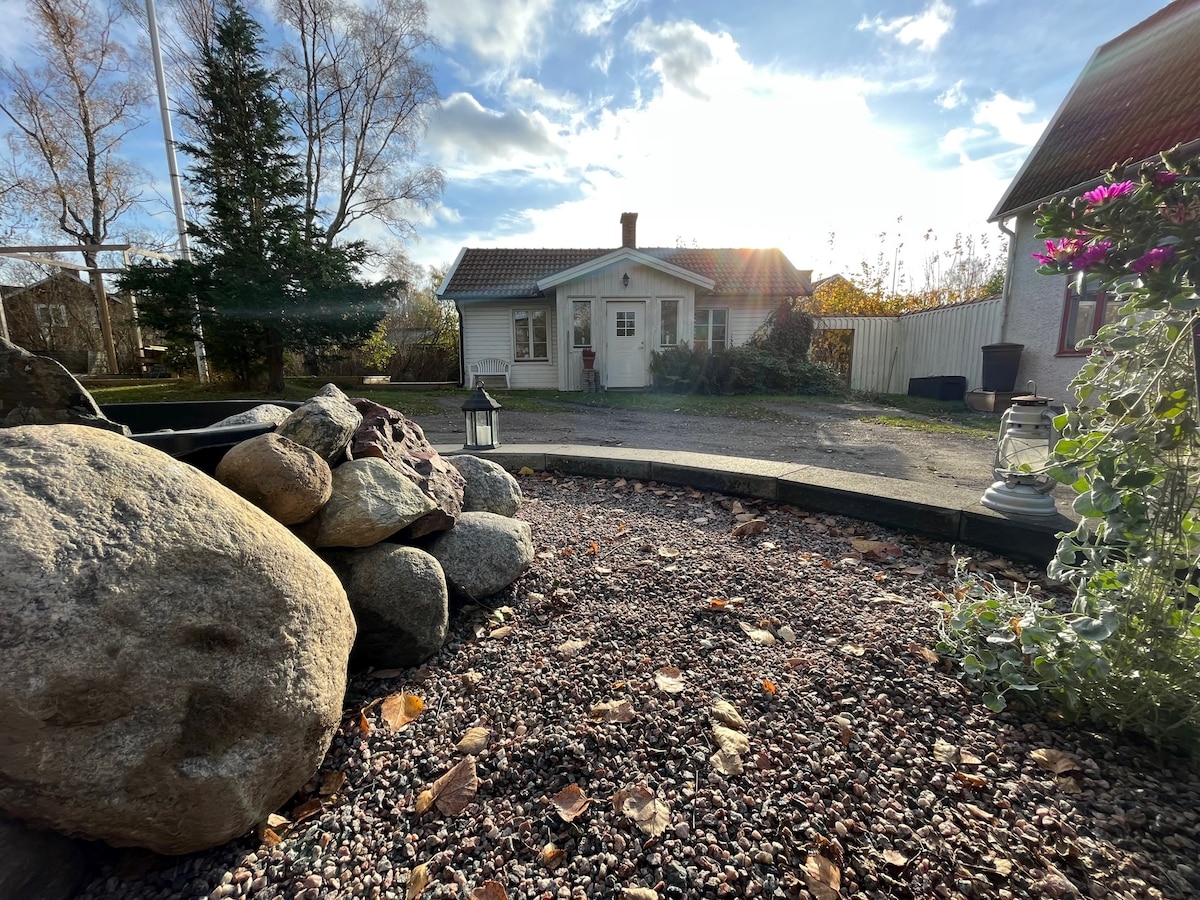 Dans la belle campagne de Sörmländ sur la route 223 entre Nyköping et Björnlunda se trouve le petit chalet de la ferme Uvsta Östergården. Le chalet est situé dans une ancienne petite ferme où nous exploitons aujourd'hui un café. Nous y avons un marché aux puces et un magasin avec des meubles pour la maison et le jardin. Le café sert des déjeuners légers et de délicieuses pâtisseries. Le petit déjeuner est disponible à l'achat dans le café. Jardin confortable avec vue sur les champs. Bagarstuga est un ancien chalet de charme de 35 m² datant du XIXe siècle avec une belle vue sur les champs. Plafond bas !